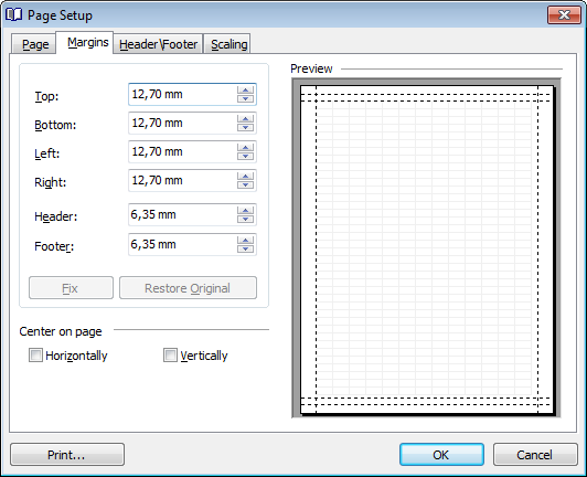 Use the spinner controls to specify the size of top / bottom / left / right margins and header / footer (in inches or millimeters, depending on the unit of measure specified in the Options dialog). The Preview area on the right illustrates the changes you have made.