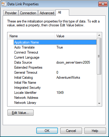 Вкладка All предназначена для просмотра и настройки всех параметров инициализации OLE DB, которые поддерживает текущий поставщик. В зависимости от используемого поставщика OLE DB параметры могут изменяться.