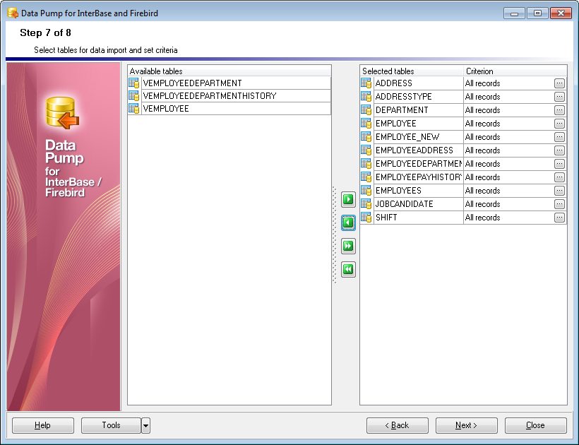 , перетаскивания или двойного щелчка мыши, переместите их в список выбранных таблиц - Selected tables.