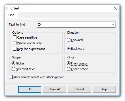 С помощью окна Find Text можно найти сочетание символов в рабочей области редактора SQL Script.