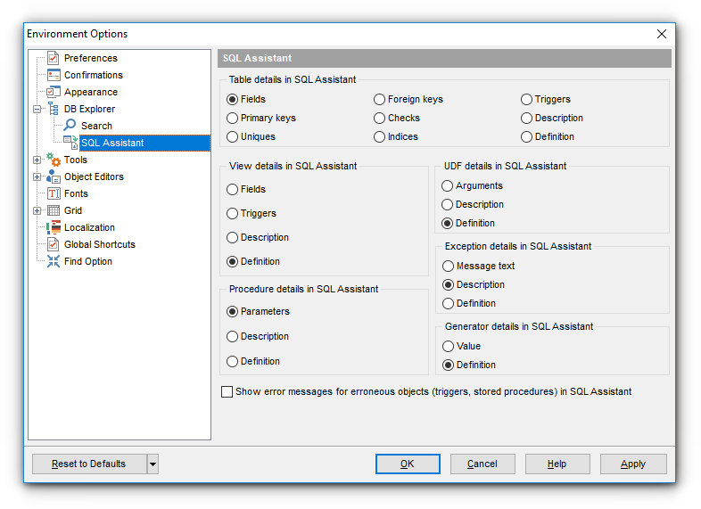 Exceptions' details in SQL Assistant - в этом разделе необходимо выбрать тип подобъектов исключения: