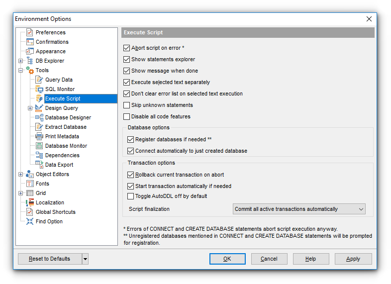 Задайте некоторые особенности выполнения SQL скрипта на вкладке SQL Script.
