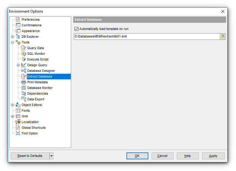 Если установлен флажок Automatically load template on run, то при извлечении базы данных автоматически будет запускаться шаблон, указанный в поле, расположенном ниже. Шаблон, который можно сохранять на последнем шаге Extract Database wizard.