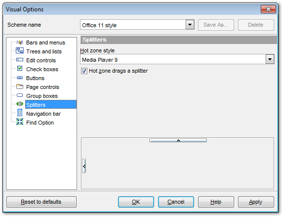 Если установлен флажок Hot zone drags a splitter, то разделитель можно перемещать, потянув за среднюю рабочую область