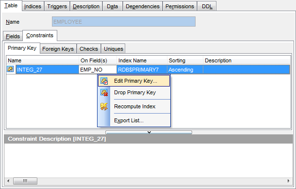 Контекстное меню первичного ключа