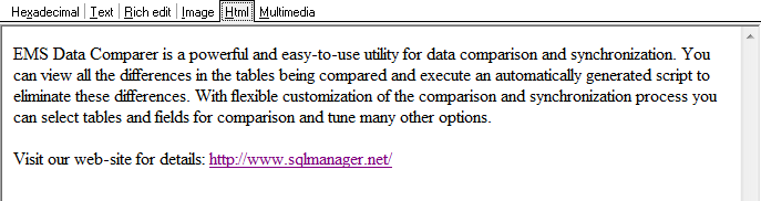 Data Comparer for SQL Server предоставляет специальный инструмент для просмотра сравниваемых BLOB (Binary Large Object) полей.