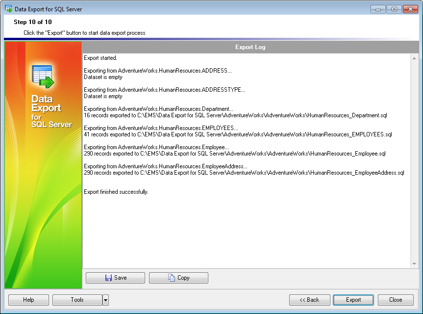 При выполнении операции в окне Export Log отображается информация о ходе выполнения экспорта данных.