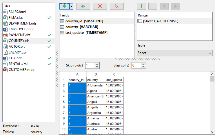 В списке Range показано соответствие, установленное между полями таблицы базы данных и столбцами таблицы Excel.