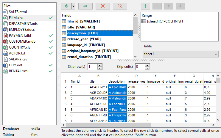 С помощью счетчиков Skip Row(s) и Skip col(s) можно указать строки и столбцы, которые не будут импортированы. Применяется для исключения заголовков из импортируемых данных.