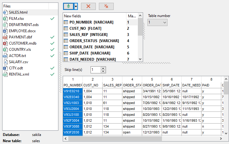 В списке New fields, отображается список полей таблицы, в которую импортируют данные. Grid Column - порядковый номер столбца. В правой части - фрагмент импортируемого документа.