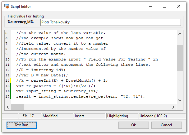 На представленном выше скриншоте показан пример использования Jscript для обработки поля Name. Приведенный код преобразует строку формата 'XXXX YYYY' в строку формата 'YYYY, XXXX'. Например, 'Piotr Tchaikovsky' -> 'Tchaikovsky, Piotr'.