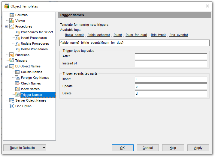 На вкладке Trigger Names задайте шаблон имени создаваемого триггера.