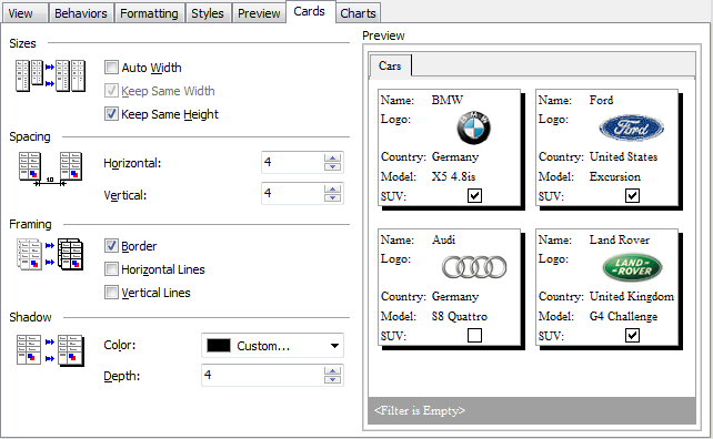 - установленный флажок Auto Width автоматически подгоняет ширину карточек