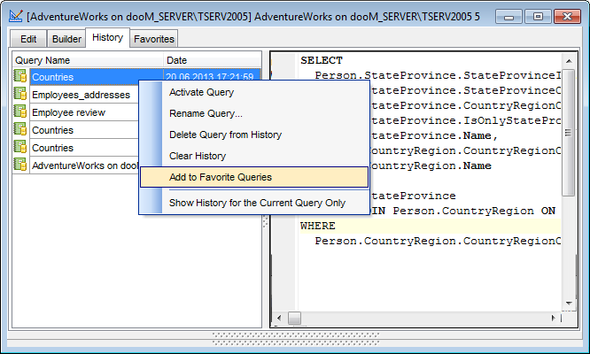 - Add to Favorite Queries - добавить выбранный запрос в избранные.