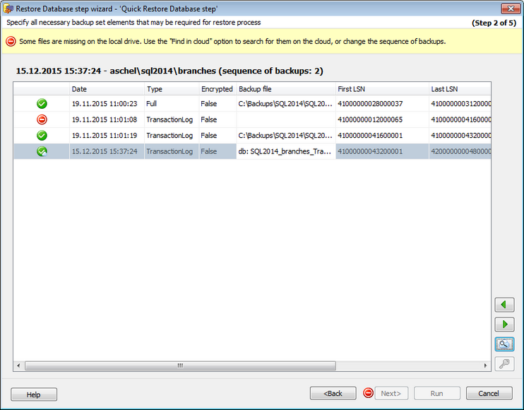 На этом шаге необходимо выбрать последовательность бэкапов для восстановления нужного состояния базы данных. Каждая предложенная программой последовательность бэкапов представляет собой комбинацию файлов, допустимую для последовательного восстановления с точки зрения SQL Server. Это гарантируется проверкой внутренних номеров последовательностей журнала LSN. В случае когда допустимыми являются несколько последовательностей с разным набором файлов бэкапов, выбрать используемую для операции восстановления можно с помощью кнопок