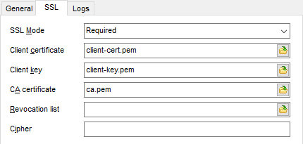На этой вкладке задаются параметры подключения через защищенное SSL-соединение. Все указываемые файлы должны иметь расширение *.pem.
