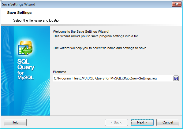 На первом шаге необходимо задать имя файла, в который будут сохранены настройки и путь к нему.