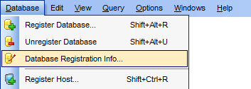 Чтобы открыть это окно нужно выделить требуемую базу данных в проводнике баз данных, затем щелкнуть по ней правой клавишей мыши и выбрать пункт контекстного меню Database Registration Info... или используйте пункт главного меню Database | Database Registration Info... Вы также можете открыть это окно с помощью кнопки
