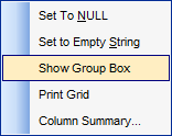 Контекстное меню позволяет выполнять следующие операции: присваивать нулевые значения (пункты Set To NULL, Set to Empty String), скрывать/отображать панель группировки (пункт Show Group Box), печатать таблицу данных (Print Grid), редактировать сводку по столбцу (Column Summary...).