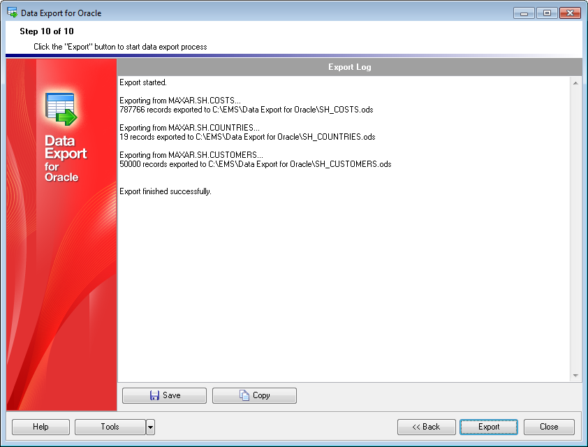 При выполнении операции в окне Export Log отображается информация о ходе выполнения экспорта данных.