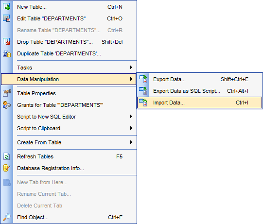 Импорт данных можно осуществлять только с помощью тех редакторов, в которых есть вкладка Data или Results. Это Редактор таблиц, Редактор представлений, Редактор запросов и Дизайнер запросов .