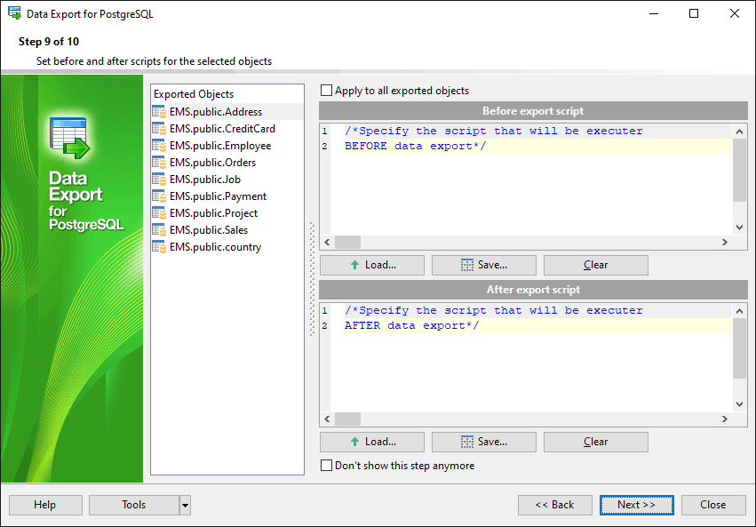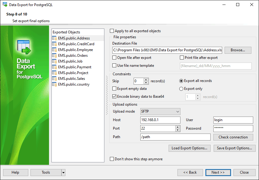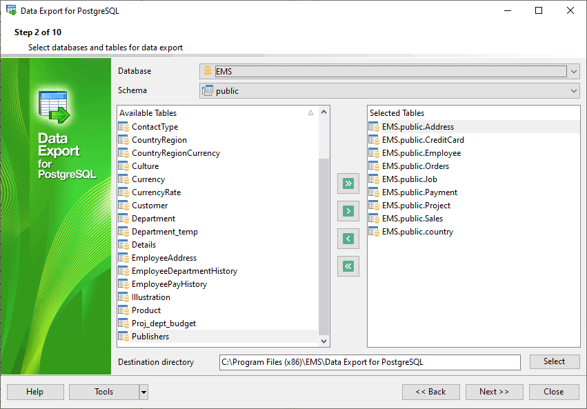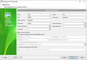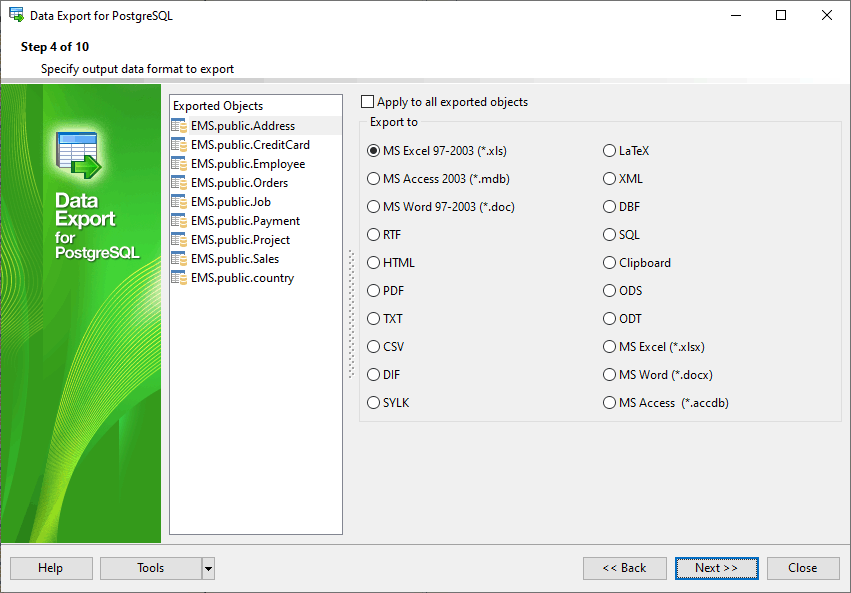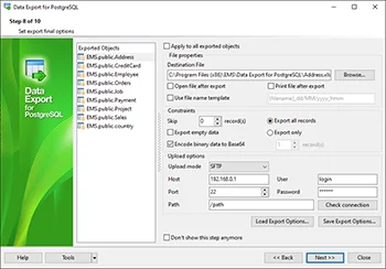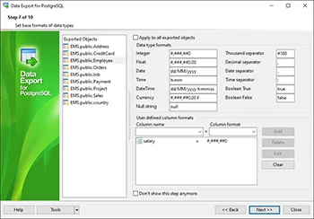 Data Export for PostgreSQL располагает удобным мастером для визуальной установки параметров экспорта из баз данных PostgreSQL (имена конечных файлов, экспортируемые поля, форматы данных и другие) и консольной утилитой для быстрого экспорта данных из таблиц PostgreSQL и запросов.