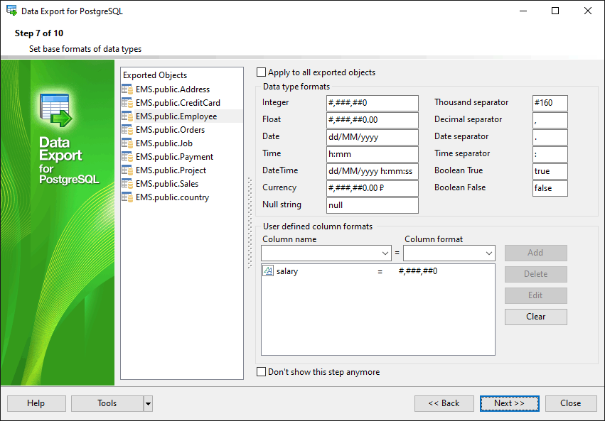 - Настраиваемые параметры экспорта для каждой таблицы, а также множество настроек экспорта для каждого формата данных