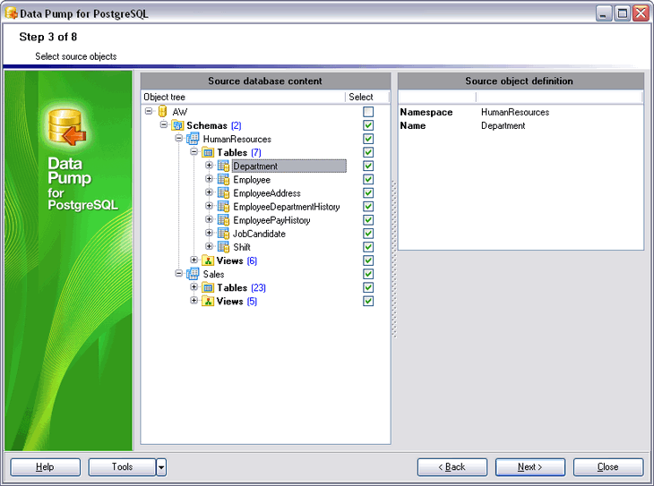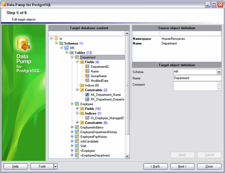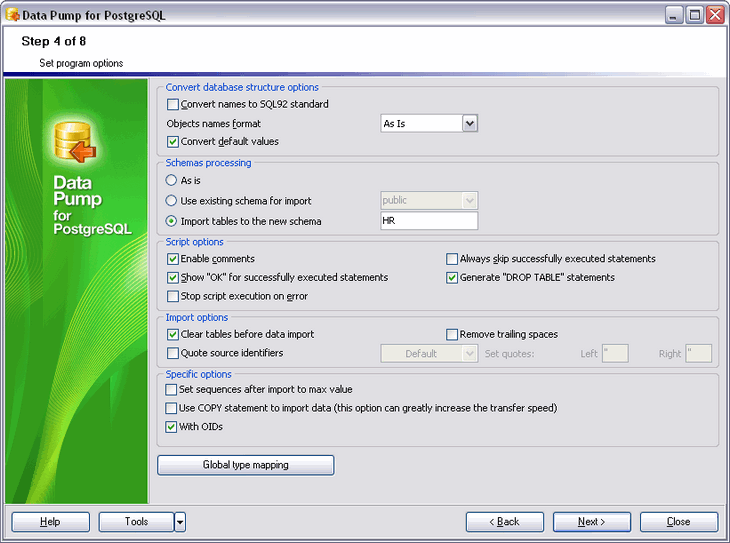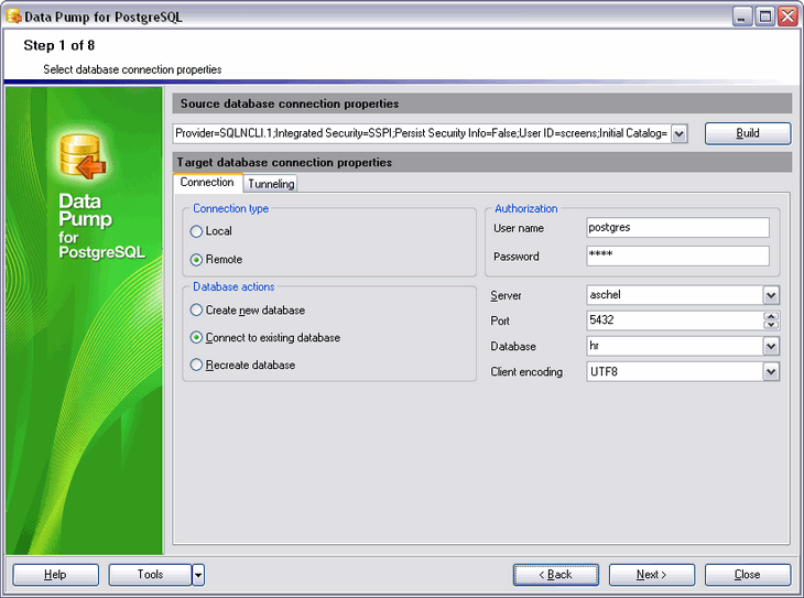 EMS Data Pump for PostgreSQL – это отличная программа для миграции баз данных и импорта данных из любых ADO-совместимых источников (например, MS Access, базы данных MS SQL или любых других баз данных с поддержкой ADO) в базы данных PostgreSQL. Удобный и простой в использовании мастер настройки позволяет задавать строки соединения c ADO, выбирать таблицы, поля и индексы для переноса, просматривать и редактировать сценарии SQL для создания целевых баз данных PostgreSQL, а также настраивать весь процесс импорта.