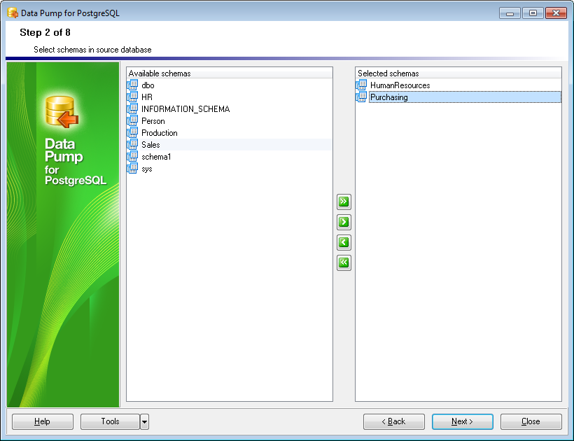 , перетаскивания или двойного щелчка мыши, переместите их в список выбранных схем - Selected schemas. Будут обработаны таблицы только из выбранных схем.