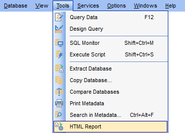 Мастер создания HTML отчетов позволит Вам создать подробный развернутый отчет о метаданных выбранной базы данных. Открывается с помощью пункта меню Tools |
