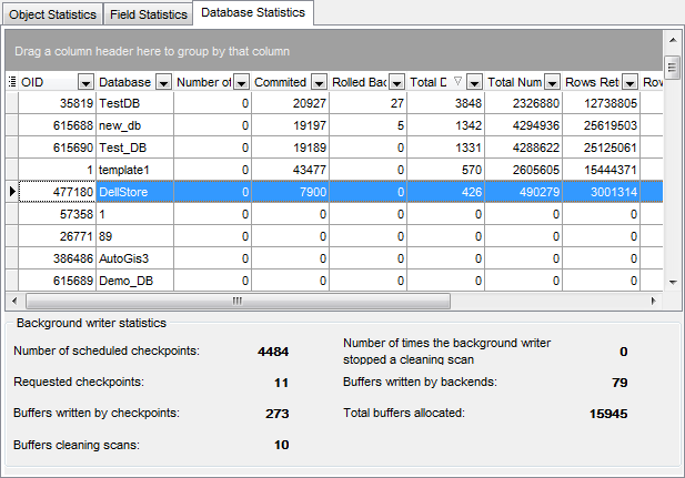 Статистика по базам данных отображается на вкладке Database Statistics.