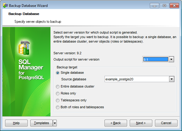Из раскрывающегося списка Output script for server version выберите версию сервера, для которой будет сгенерирован скрипт резервной копии. Доступные версии: 9.3, 9.2, 9.1, 9.0, 8.4, 8.3, 8.2, 8.1, 8.0 or 7.4.