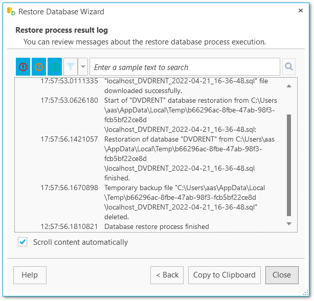 Restore database - result log