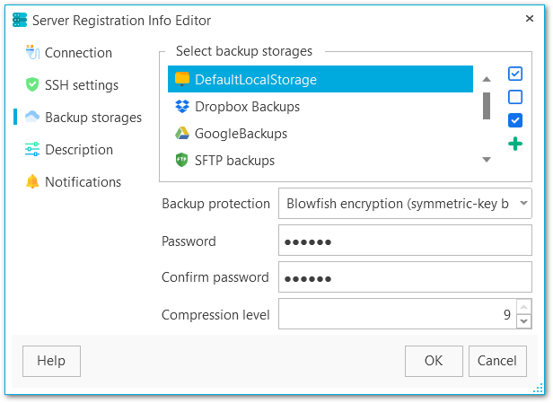 На этой вкладке вы можете просматривать и редактировать информацию о хранилищах резервных копий. Если для сервера выбраны несколько хранилищ, то файлы резервных копий будут копироваться в каждое из них.